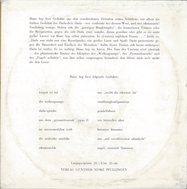 HANS ARP liest HANS ARP Überspielung, öffentliche Aufführung und Rundfunksendung untersagt Alle Herstellerund Urheberrechte beim VERLAG GÜNTHER NESKE PFULLINGEN Textheft zur Sprechplatte durée : 00:30:41